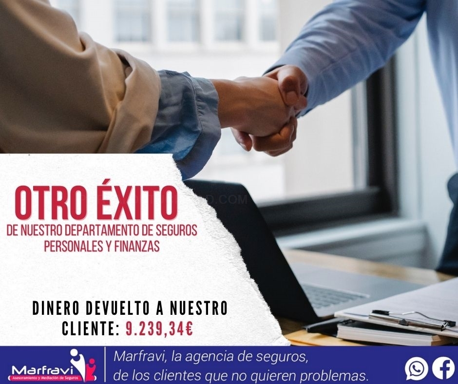 Gracias a las gestiones realizadas por parte de nuestro responsable de seguros personales y finanzas en defensa de los derechos de nuestro cliente, la entidad bancaria le ha devuelto 9.239,34 € por los seguros que indebidamente le había contratado y cobrado.